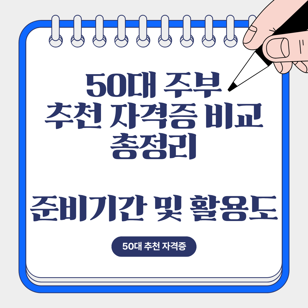 [요약 정리]50대 주부에게 적합한 자격증은 목적에 따라 다릅니다.취득 기간, 체력 부담, 활용 방식이 선택 기준이 됩니다.단기 vs 장기 목표를 먼저 정하는 것이 중요합니다. 50대 주부가 자격증을 고민할 때 가장 많이 하는 질문은 “그래서 나한테는 뭐가 제일 맞을까?”입니다.자격증마다 취득 기간, 활용 방식, 부담 정도가 다르기 때문에 단순 추천보다는 비교 기준을 먼저 잡는 것이 중요합니다.이번 글에서는 지금까지 소개한 자격증들을 50대 주부 기준으로 한눈에 비교해 정리했습니다.1️⃣ 50대 주부 자격증 한눈에 비교자격증취득 기간체력 부담활용 방식추천 유형요양보호사수개월중~높음취업안정적인 일자리정리수납 전문가2~4개월낮음~중부업·프리랜서유연한 활동병원 코디네이터1~3개월낮음취업·파트타임사무·상담 선호..
